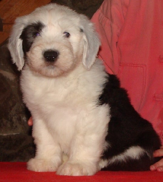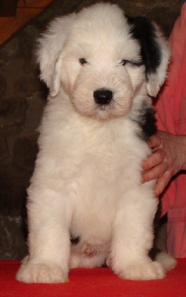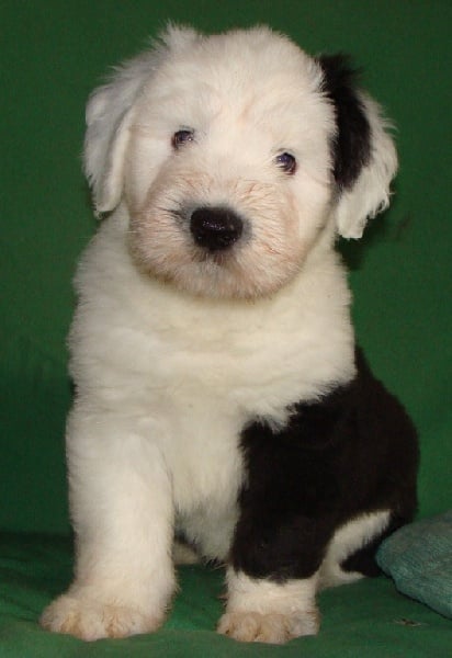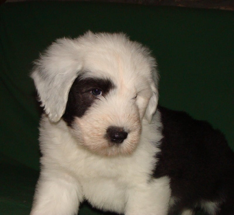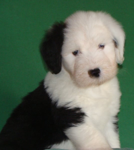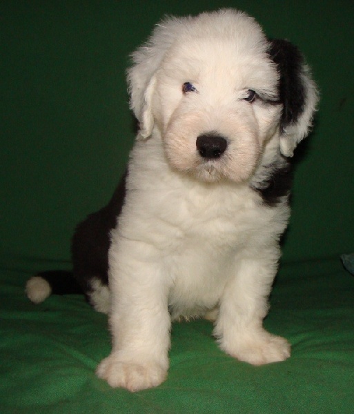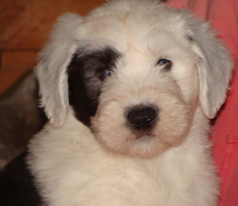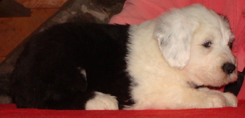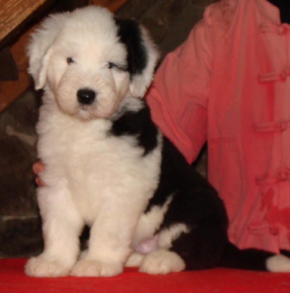 Un dégourdi ! Toujours le premier à trouver la meilleure tétine. Quand les autres pleurent parce qu'ils sont dans le dos de la mère , là où ils ne trouvent pas de tétine, lui, il ne perd pas son temps à pleurer, il fait le tour aussi vite qu'il peut ! Petite panachure remontant de la patte avant gauche. Petit coquard à gauche. Plus de renseignements et de photos sur : http://www.bobtail-chiens.com/