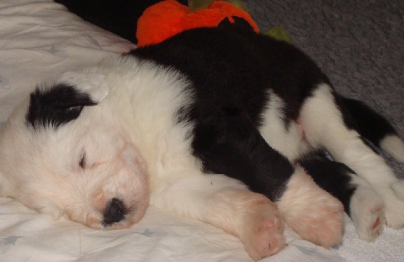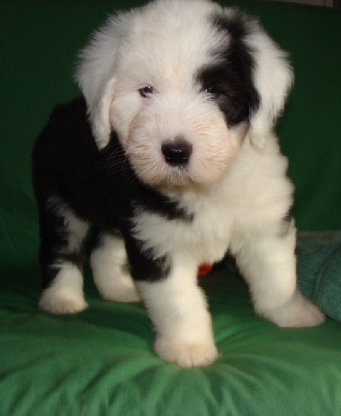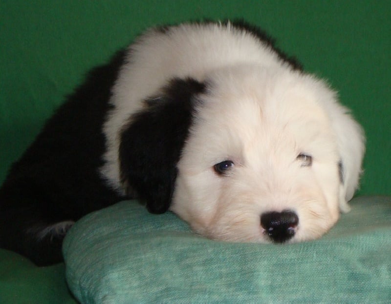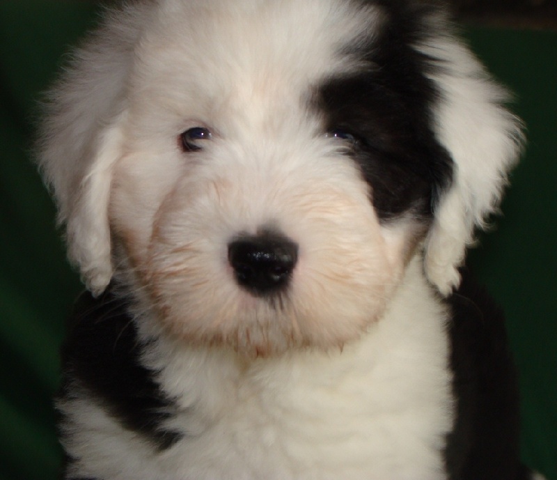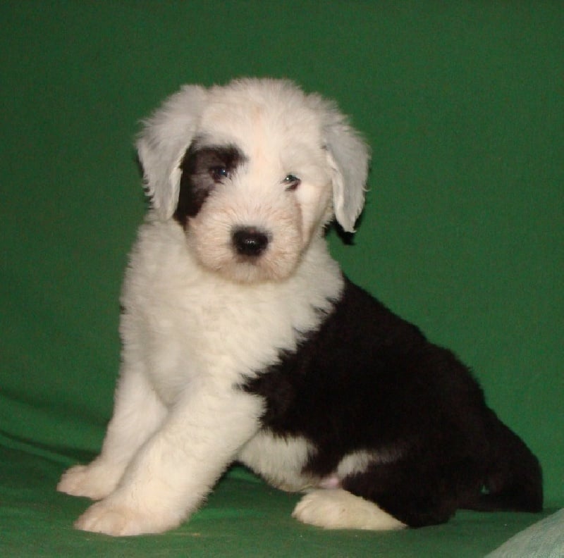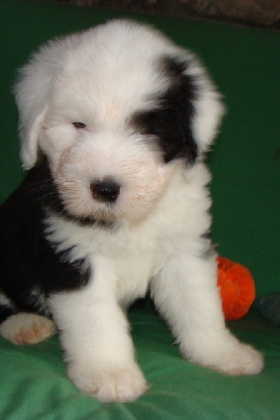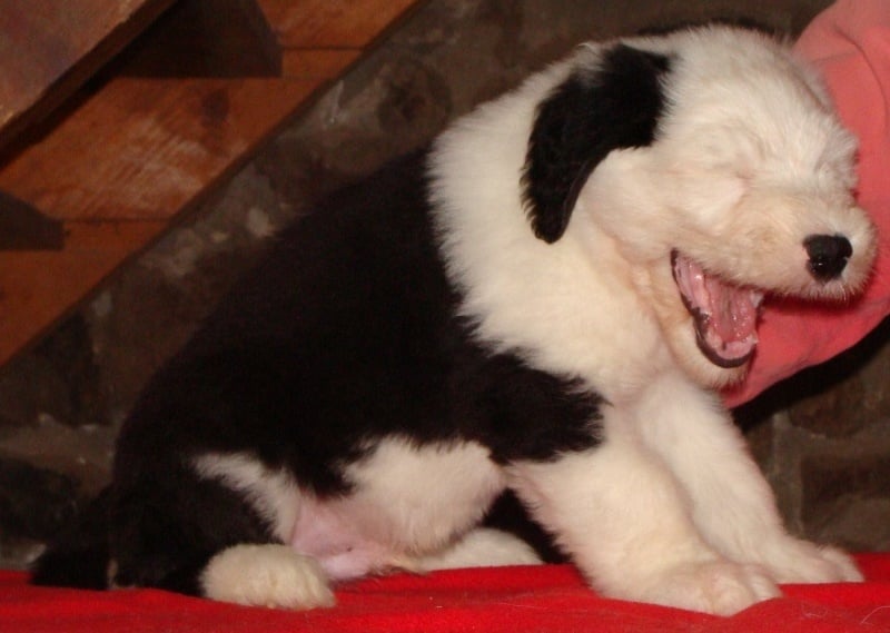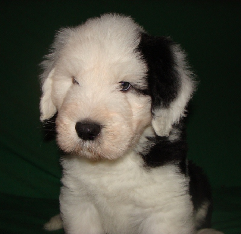 Un dégourdi ! Toujours le premier à trouver la meilleure tétine. Quand les autres pleurent parce qu'ils sont dans le dos de la mère , là où ils ne trouvent pas de tétine, lui, il ne perd pas son temps à pleurer, il fait le tour aussi vite qu'il peut ! Petite panachure remontant de la patte avant gauche. Petit coquard à gauche. Plus de renseignements et de photos sur : http://www.bobtail-chiens.com/
